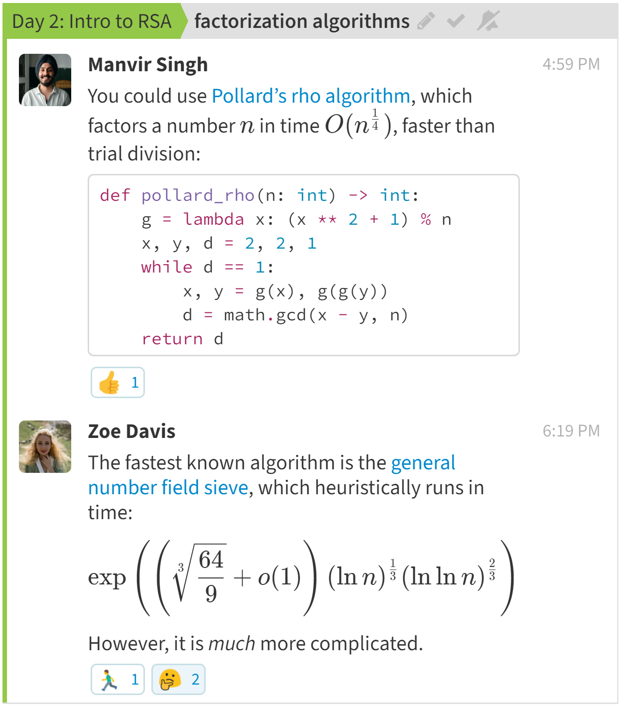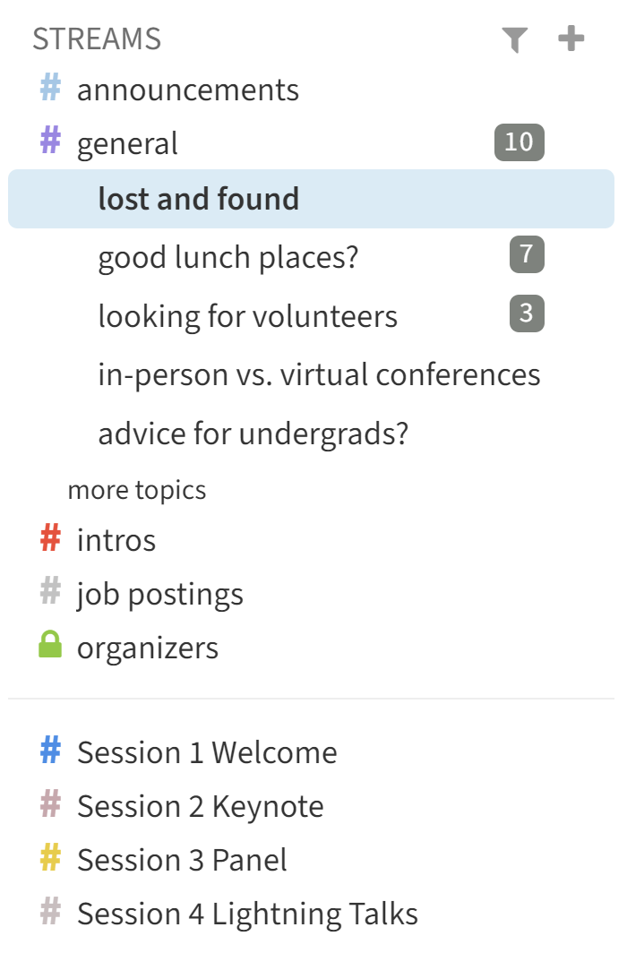 Discussions at conferences often happen in small groups — most people are not able to participate because they are not present, or are too intimidated to join. In the conferences we organized with Zulip, questions or ideas were spread openly. Anybody could get a chance to contribute, and to benefit from new ideas and opportunities for collaboration.