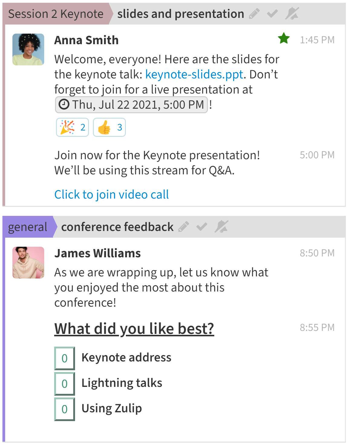 Zulip is the only modern team chat app that is ideal for both live and asynchronous conversations. Post presentations and announcements, host Q&A sessions, and coordinate among organizers.